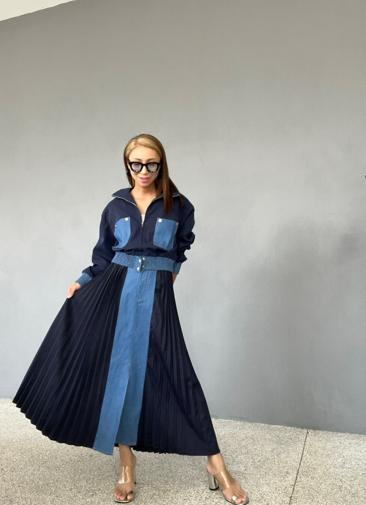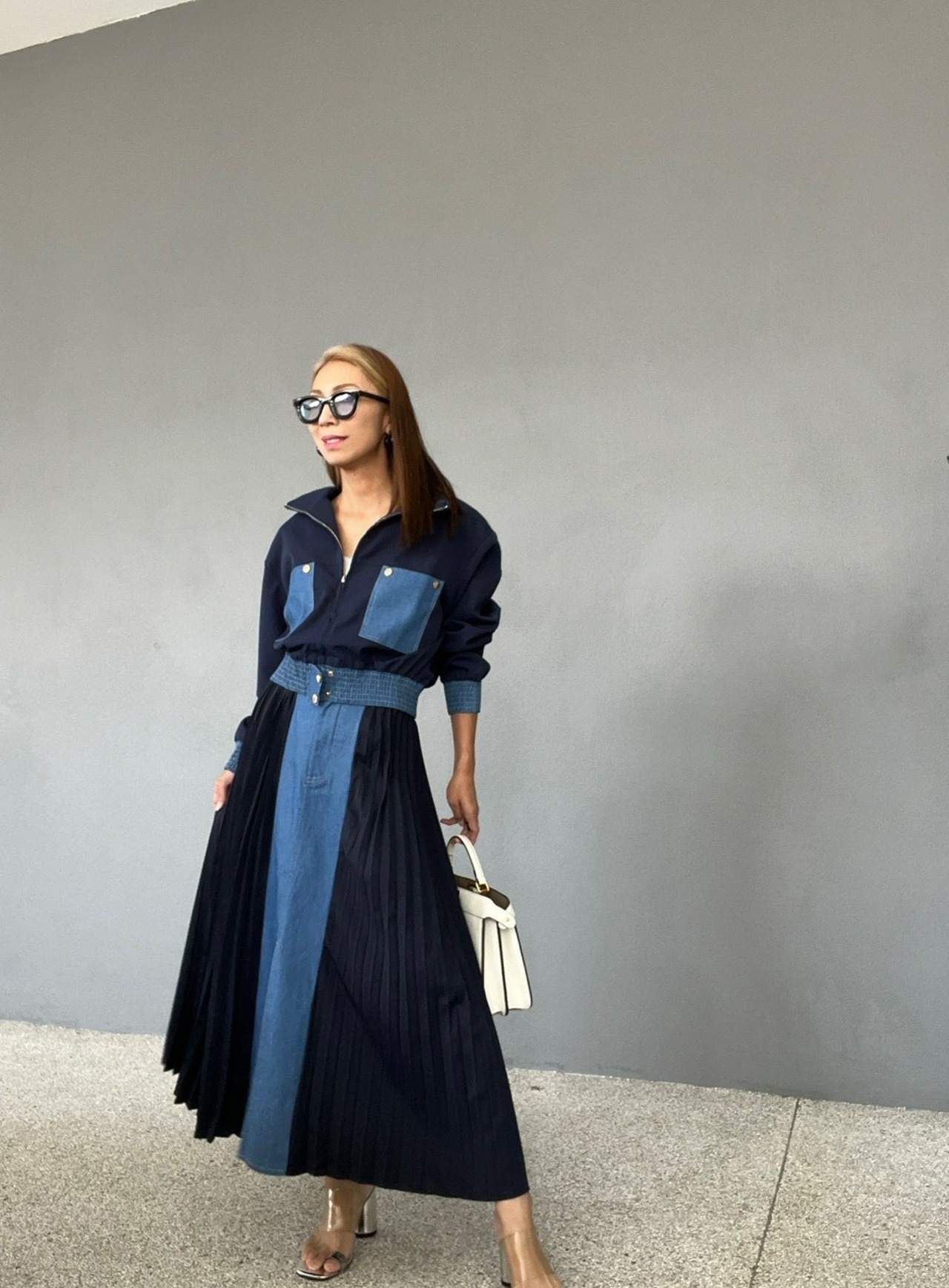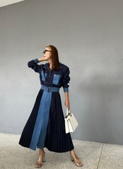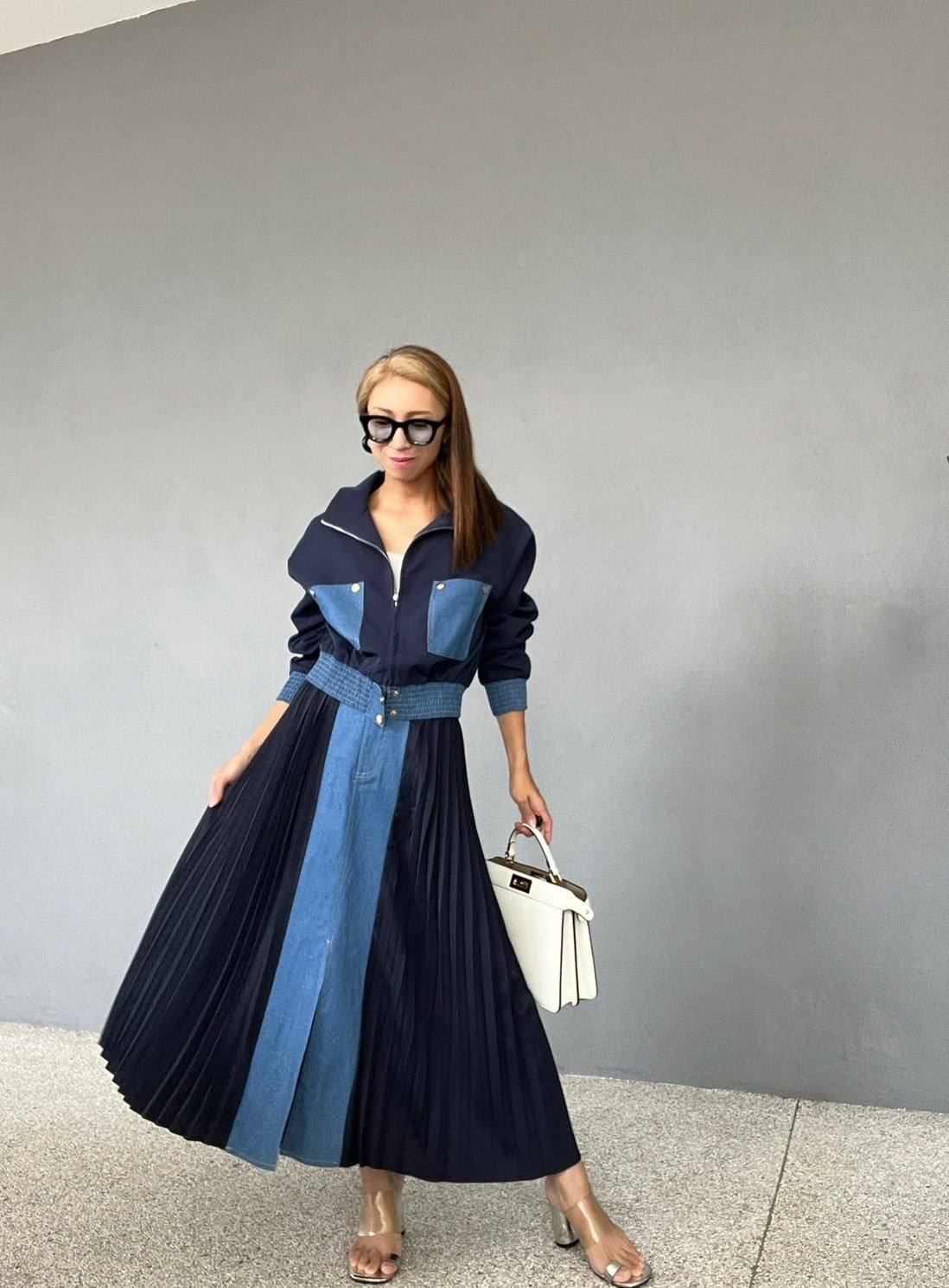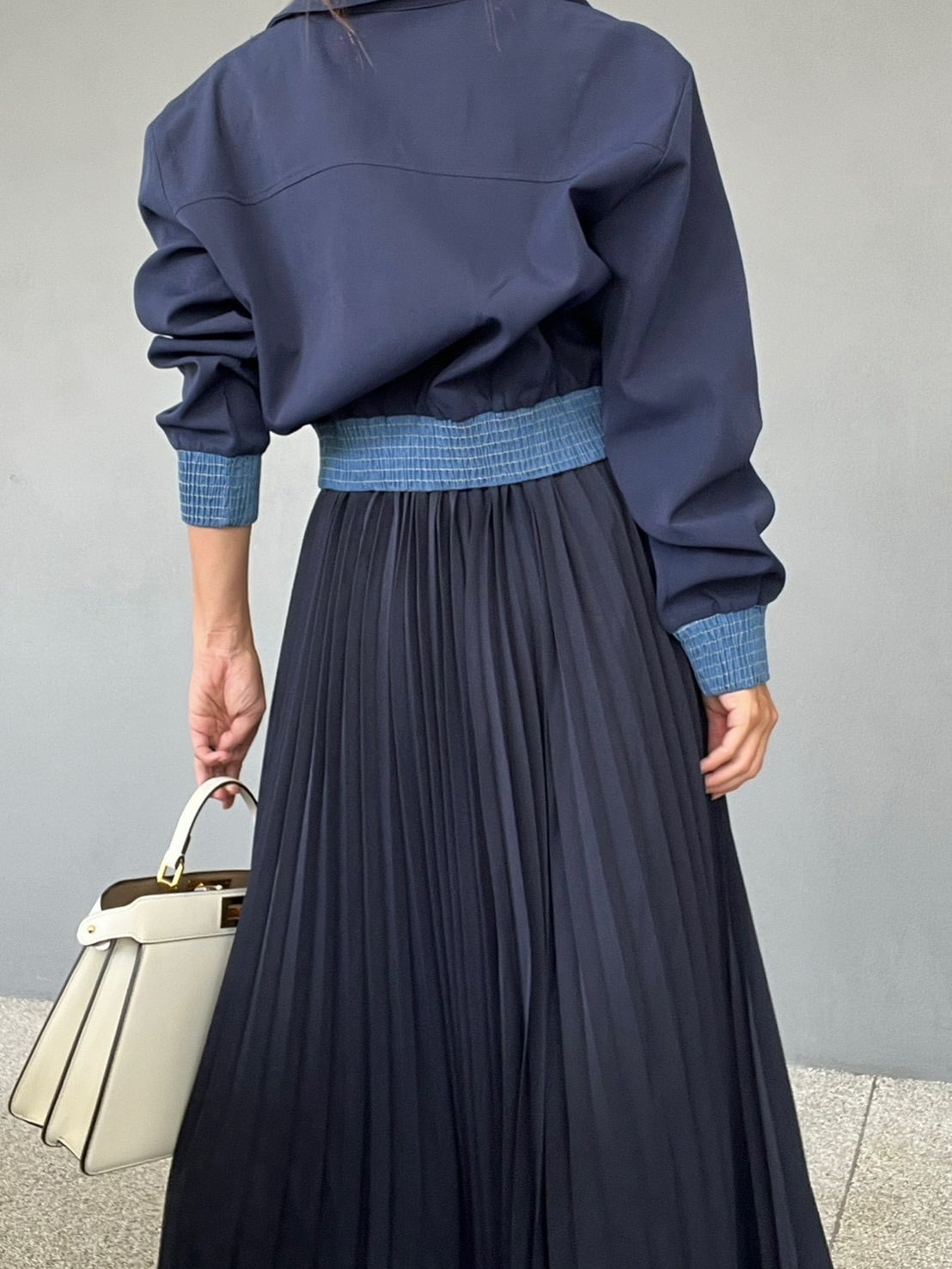 ハリのあるプリーツが動くたびに美しく揺れ、存在感のあるシルエットを演出。フロントのライトデニムが抜け感をプラスします。