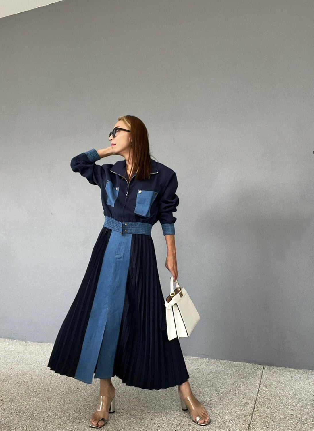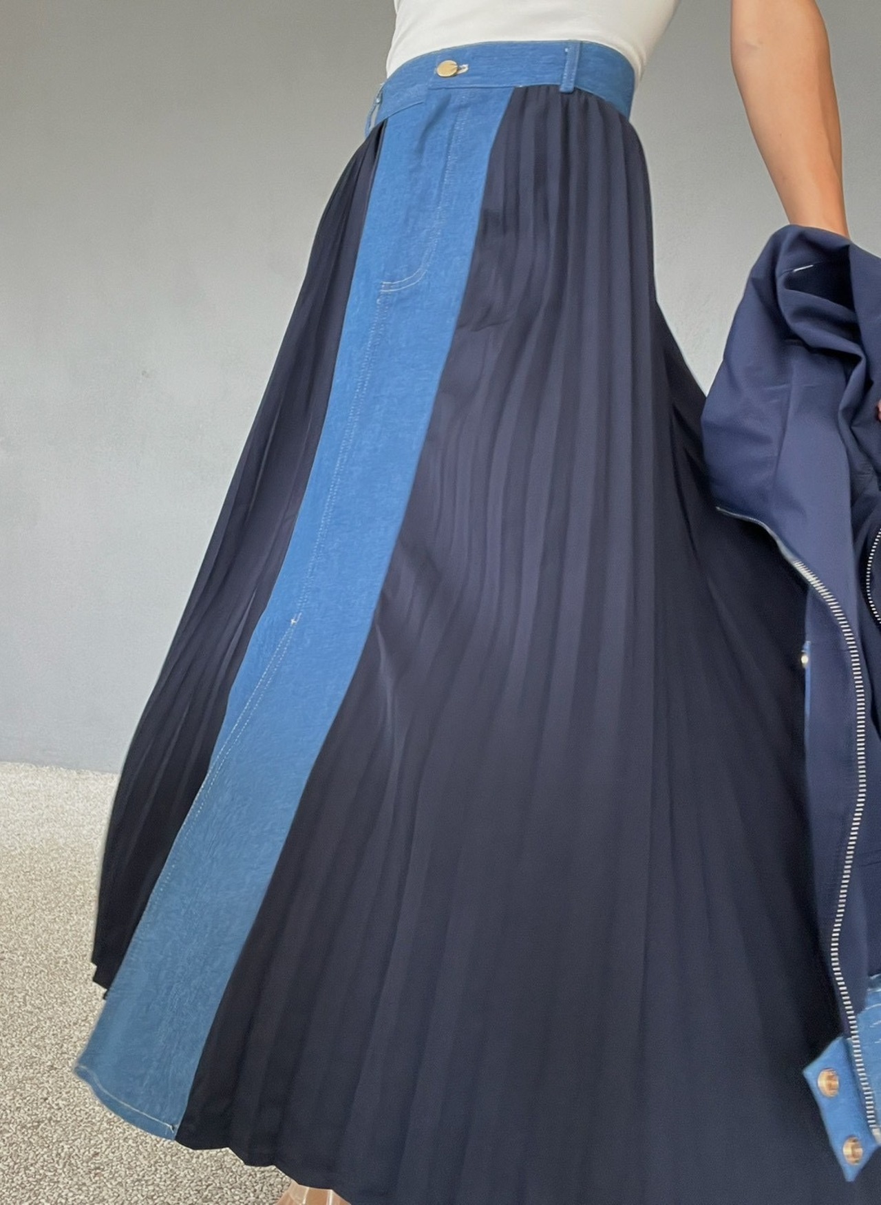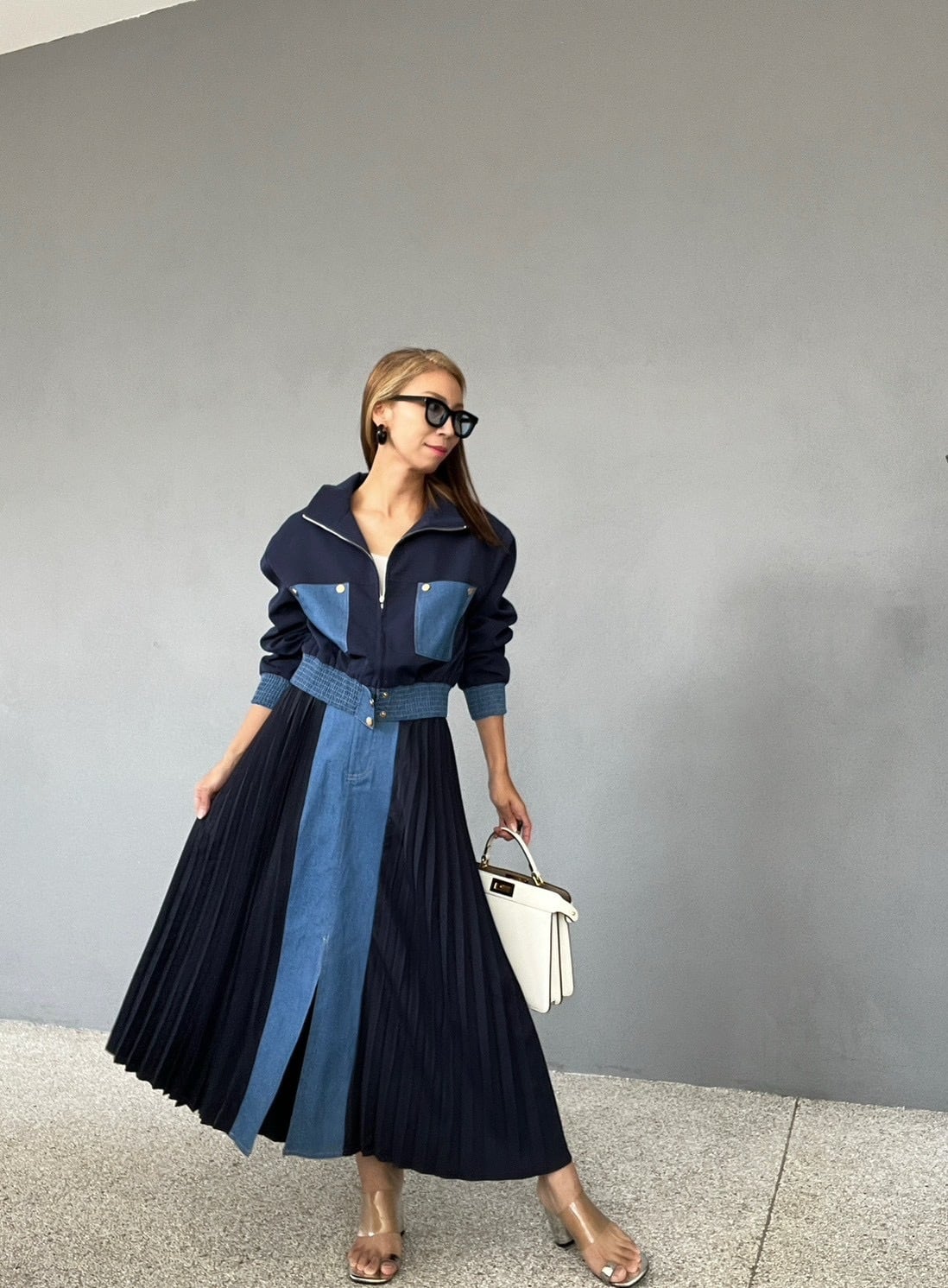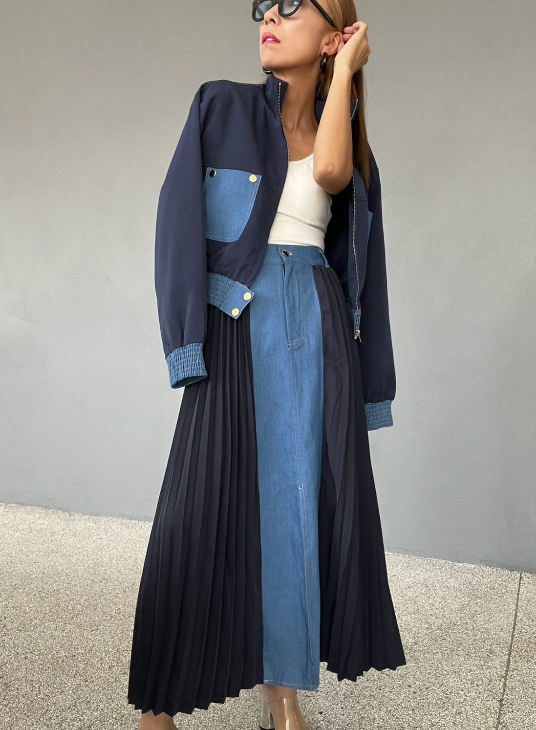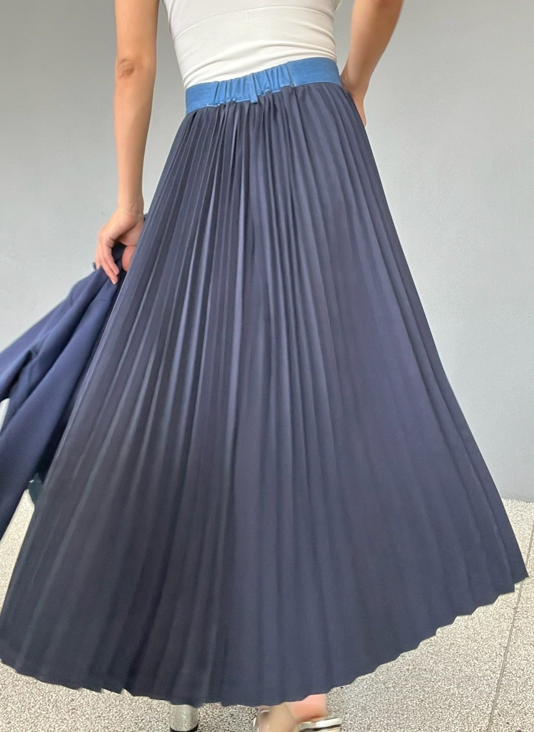 ハリのあるプリーツが動くたびに美しく揺れ、存在感のあるシルエットを演出。フロントのライトデニムが抜け感をプラスします。