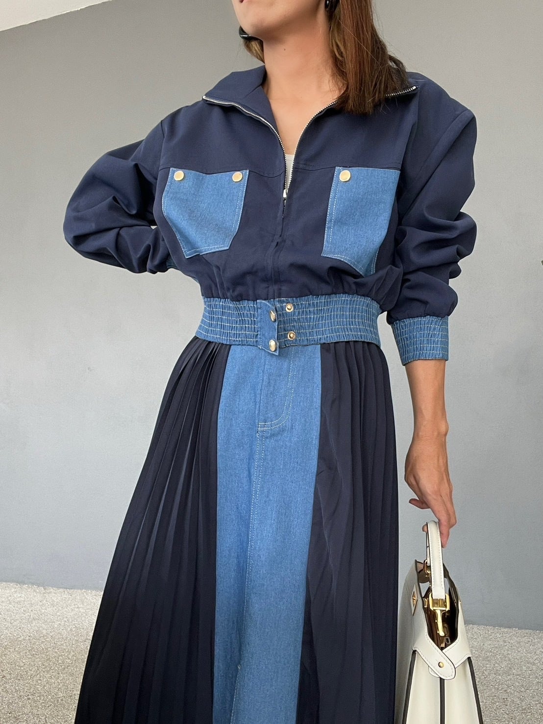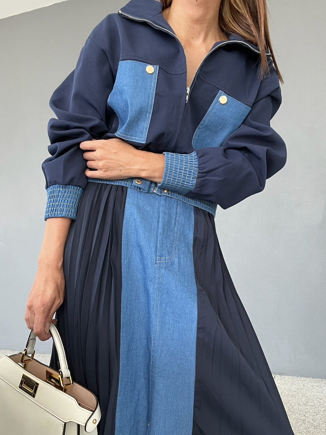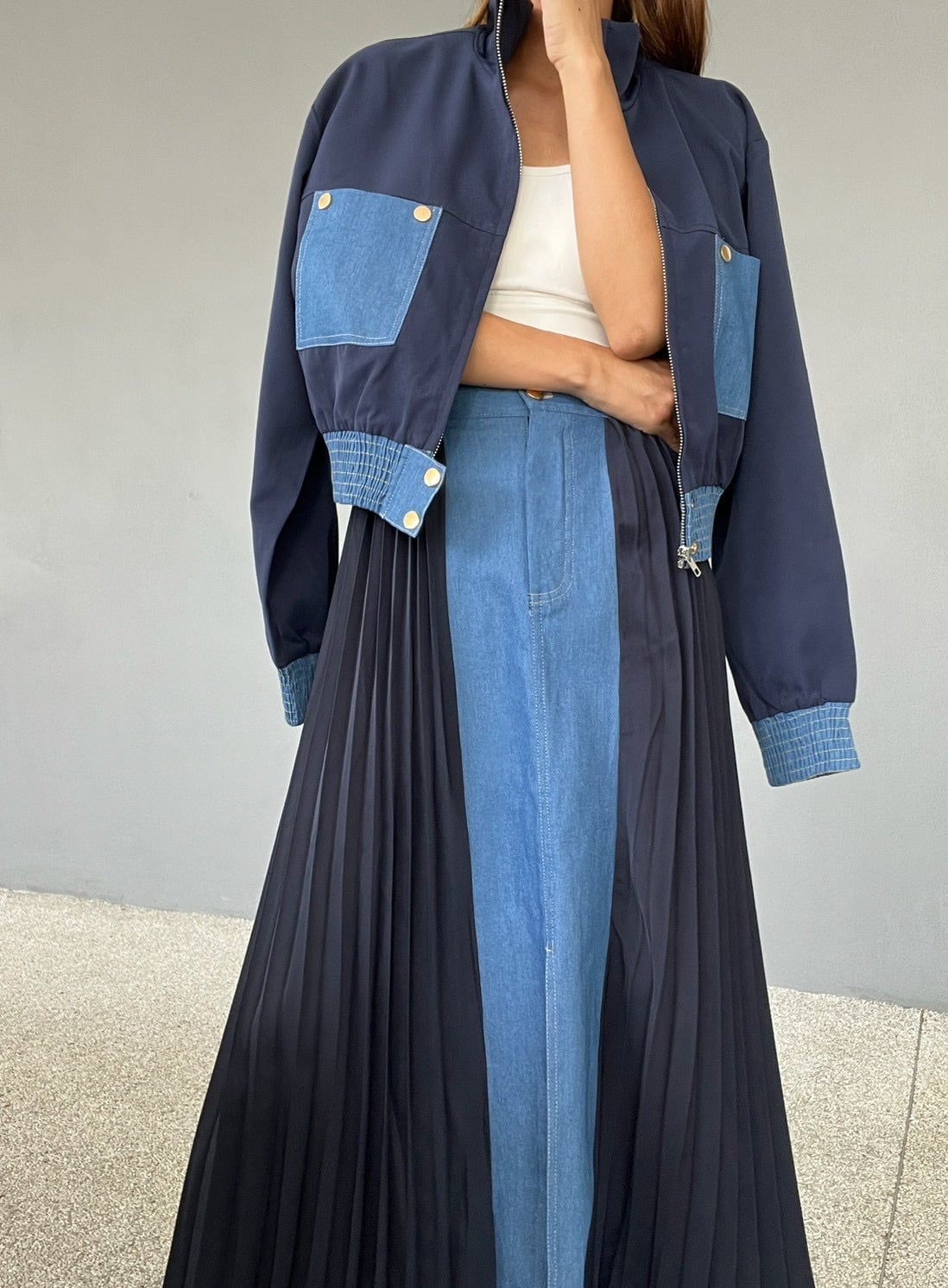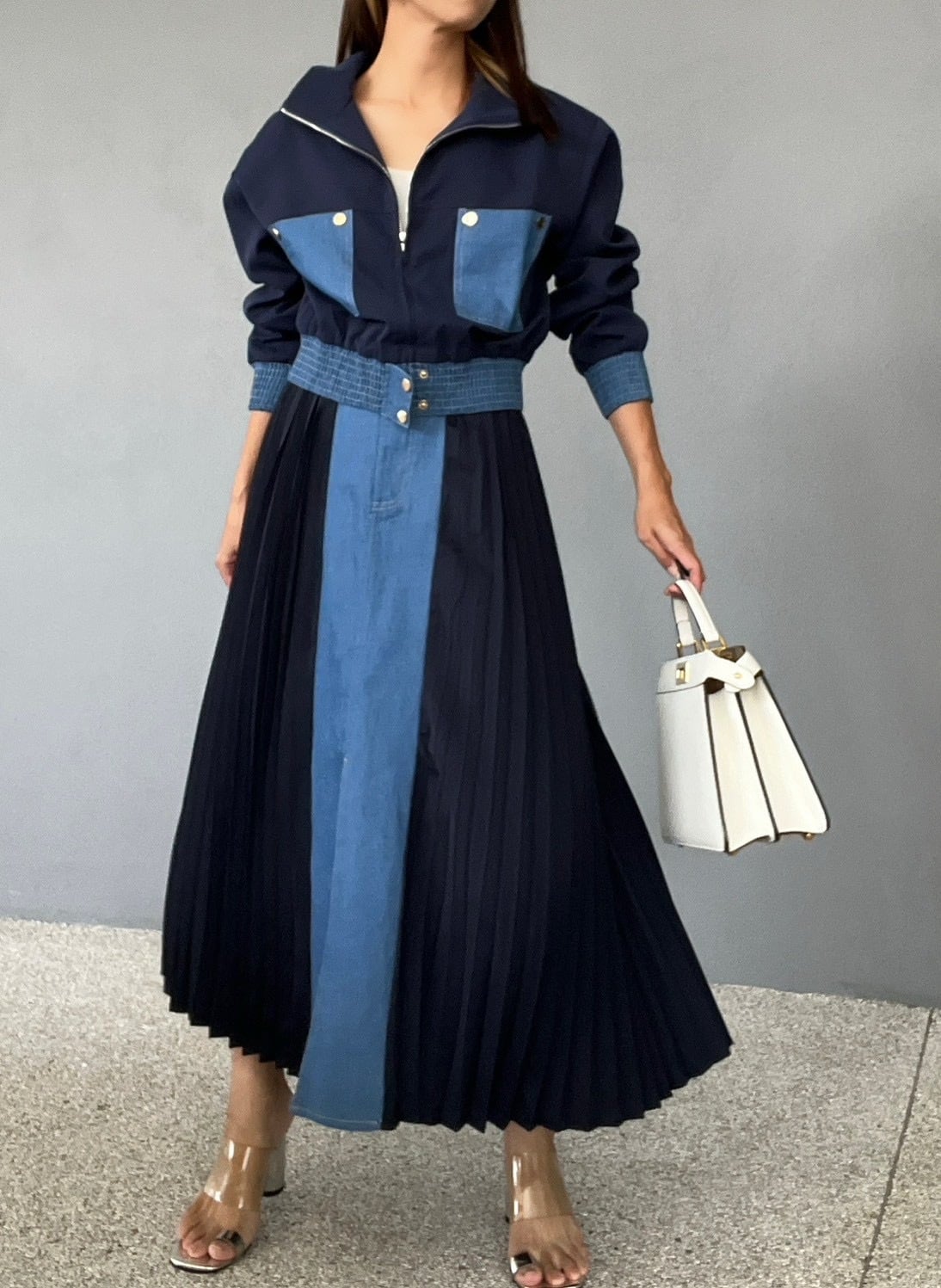 ハリのあるプリーツが動くたびに美しく揺れ、存在感のあるシルエットを演出。フロントのライトデニムが抜け感をプラスします。