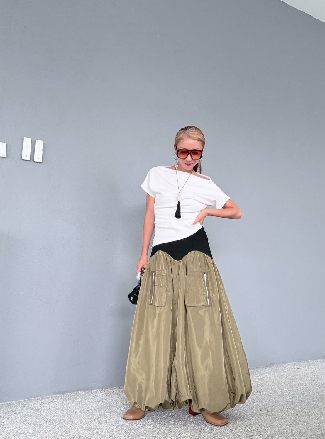 さらりとしたナイロンタフタ生地を贅沢に使用した、立体的なバルーンシルエットが魅力のロングスカート。薄手で柔らかく、軽い穿き心地に加え、ほんのりとした光沢がモードな印象を引き立てます。