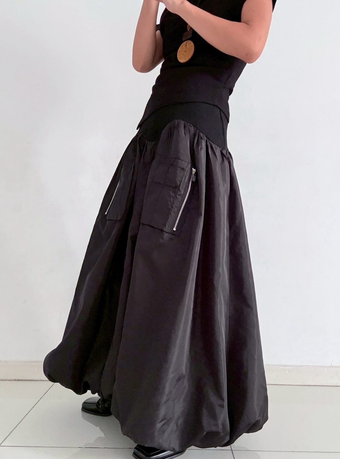 さらりとしたナイロンタフタ生地を贅沢に使用した、立体的なシルエットが魅力のロングスカート。薄手で柔らかく、軽い穿き心地に加え、ほんのりとした光沢がモードな印象を引き立てます。
