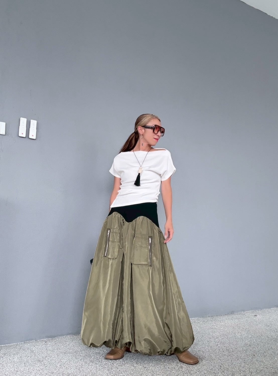 裾はゴムを使わず丁寧に仕立てることで、広がりを保ちながら自然なバルーンシルエットを形成。動くたびにふんわりと立体感のあるフォルムを演出します。