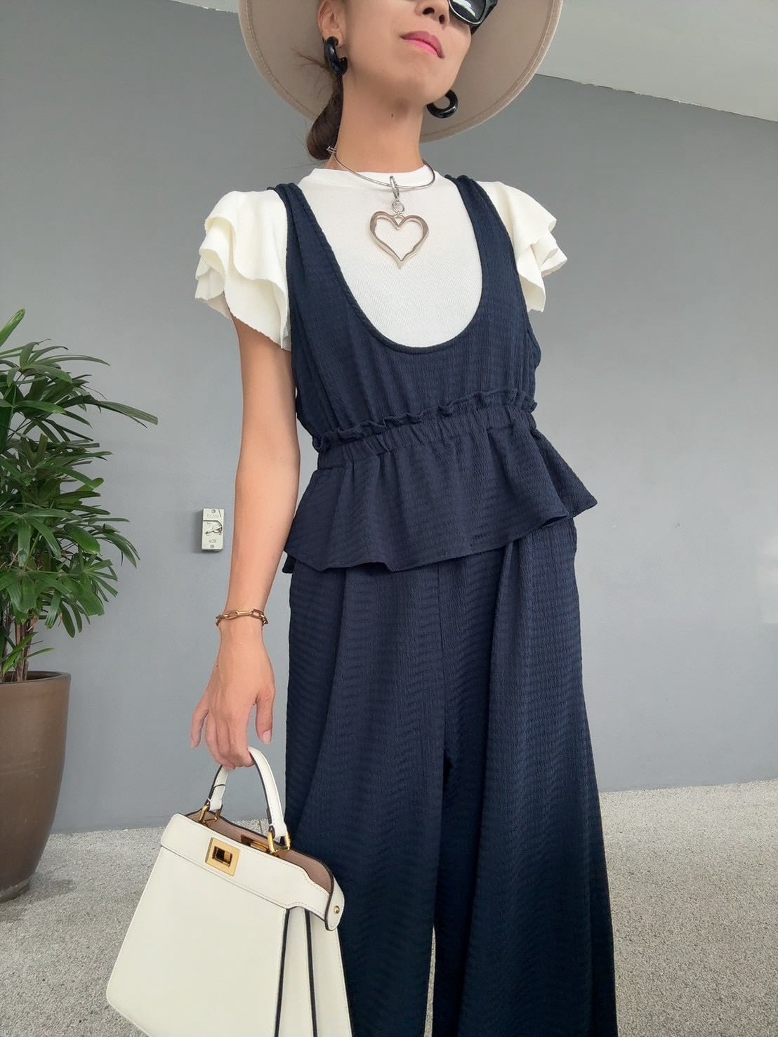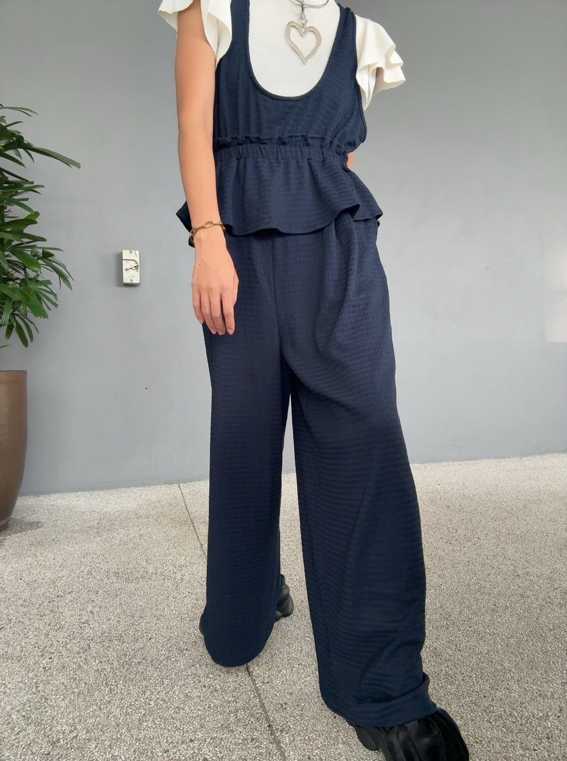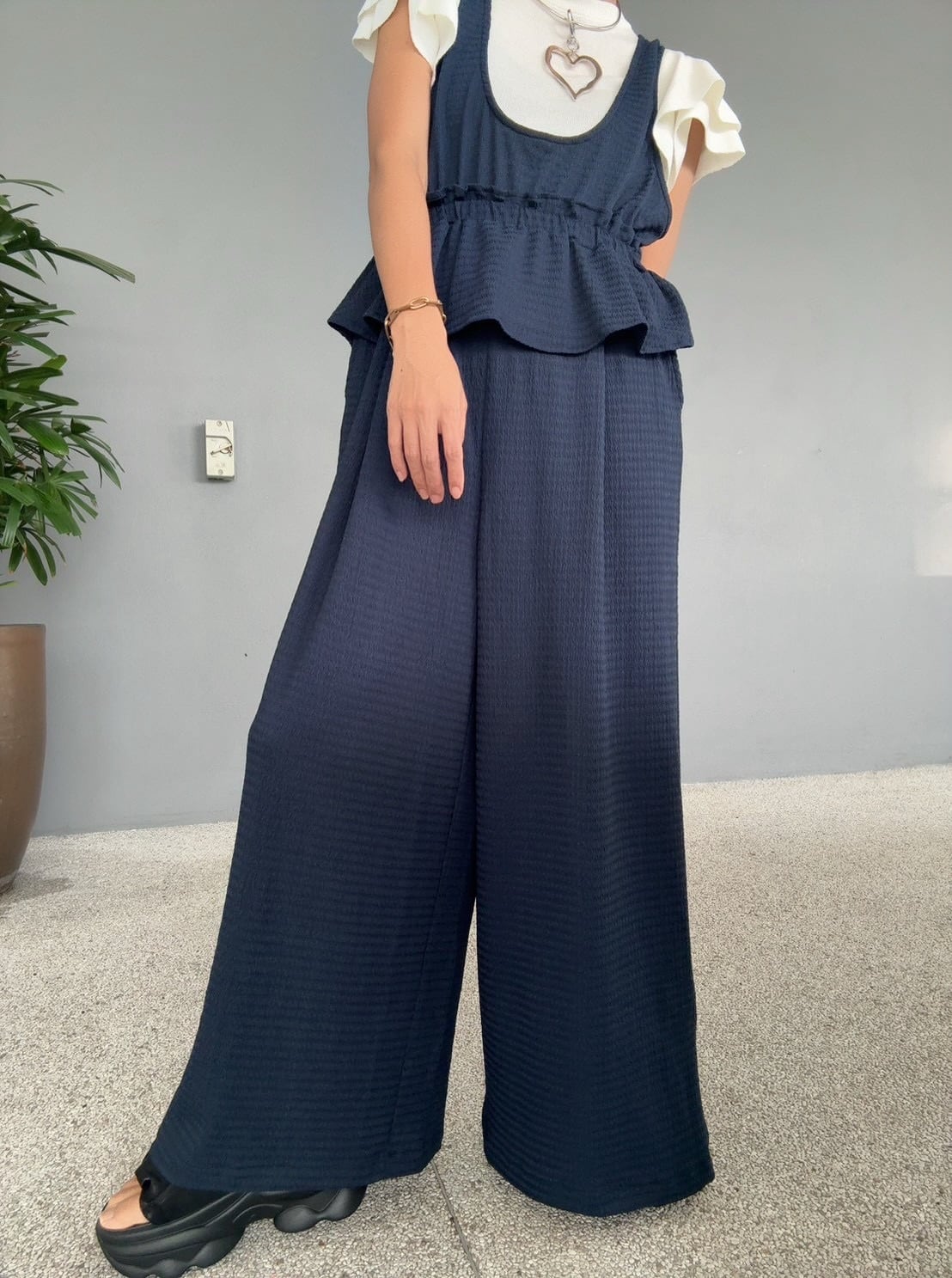 前は短く後ろは長めに設計されたペプラムデザイン、ウエストは一周ゴム仕様で締め付け感がなく、リラックスした着心地です。