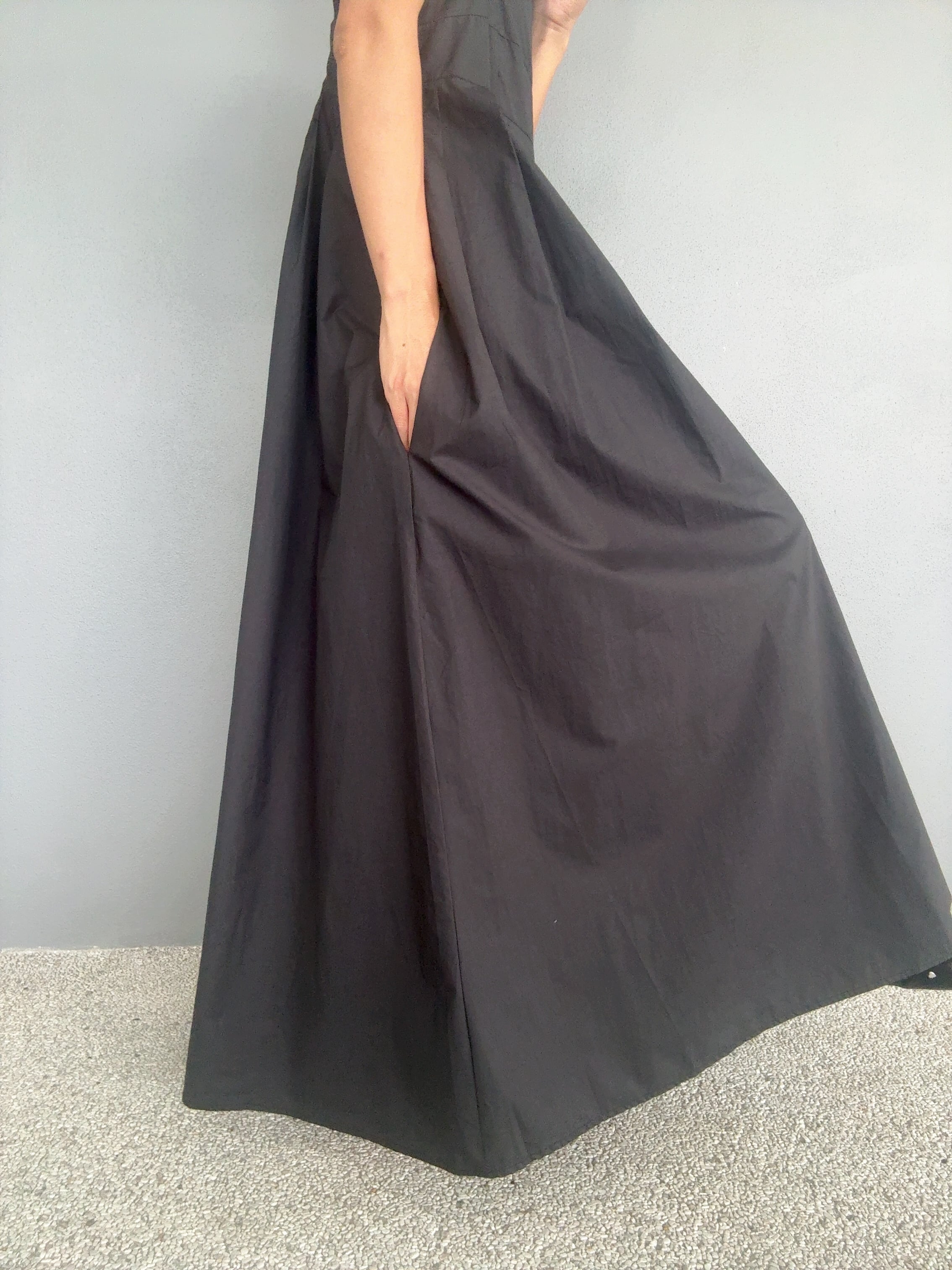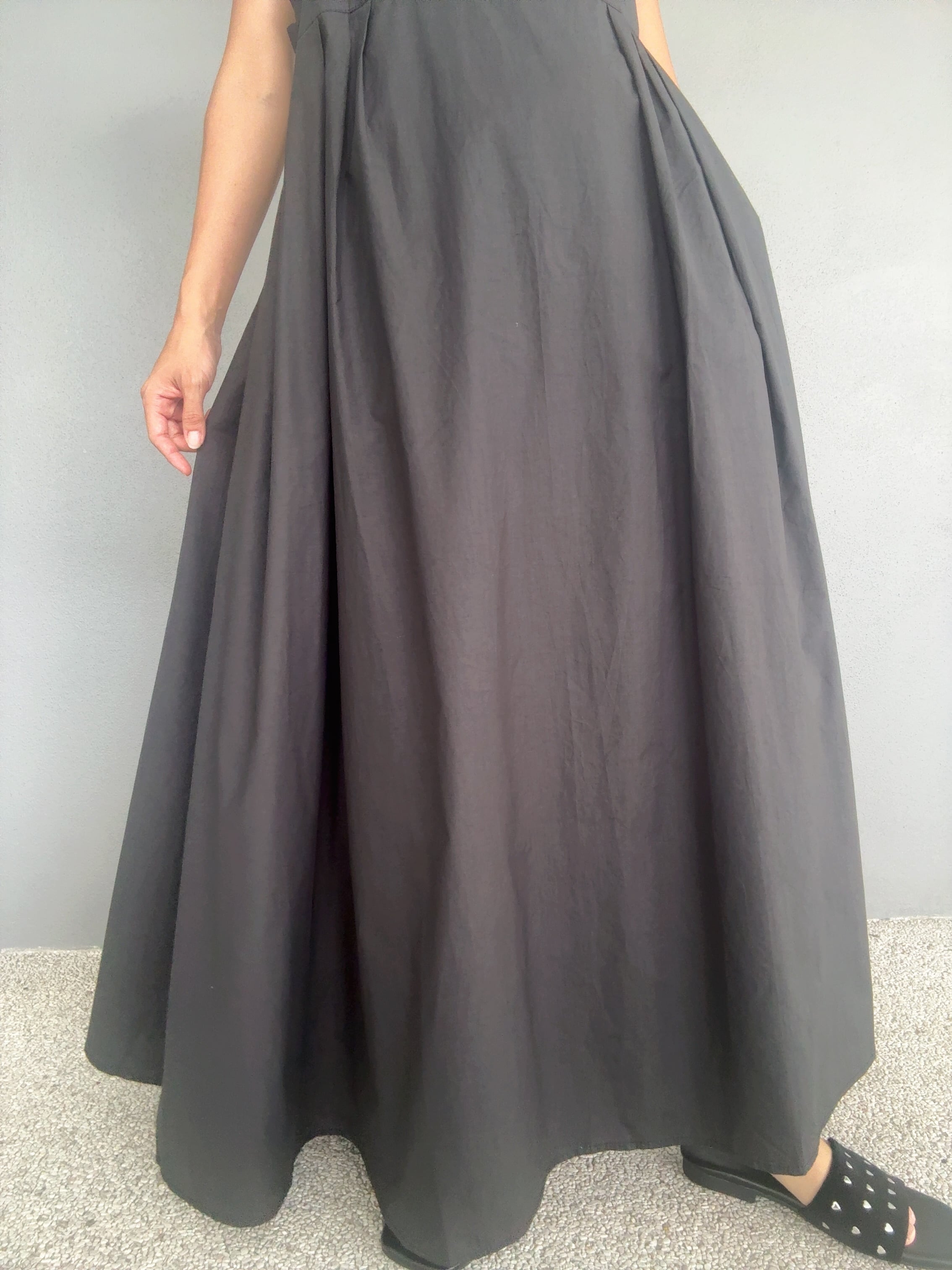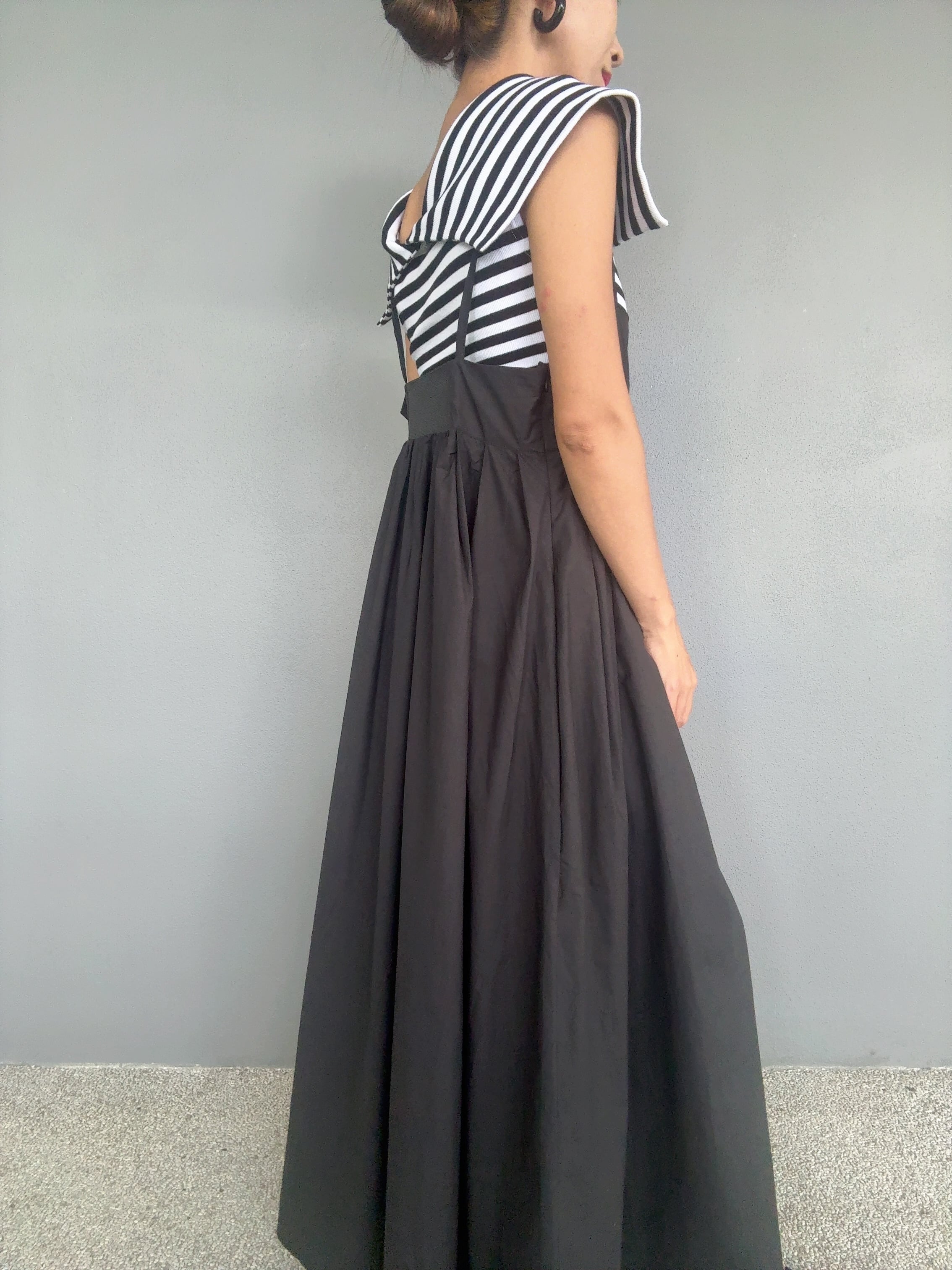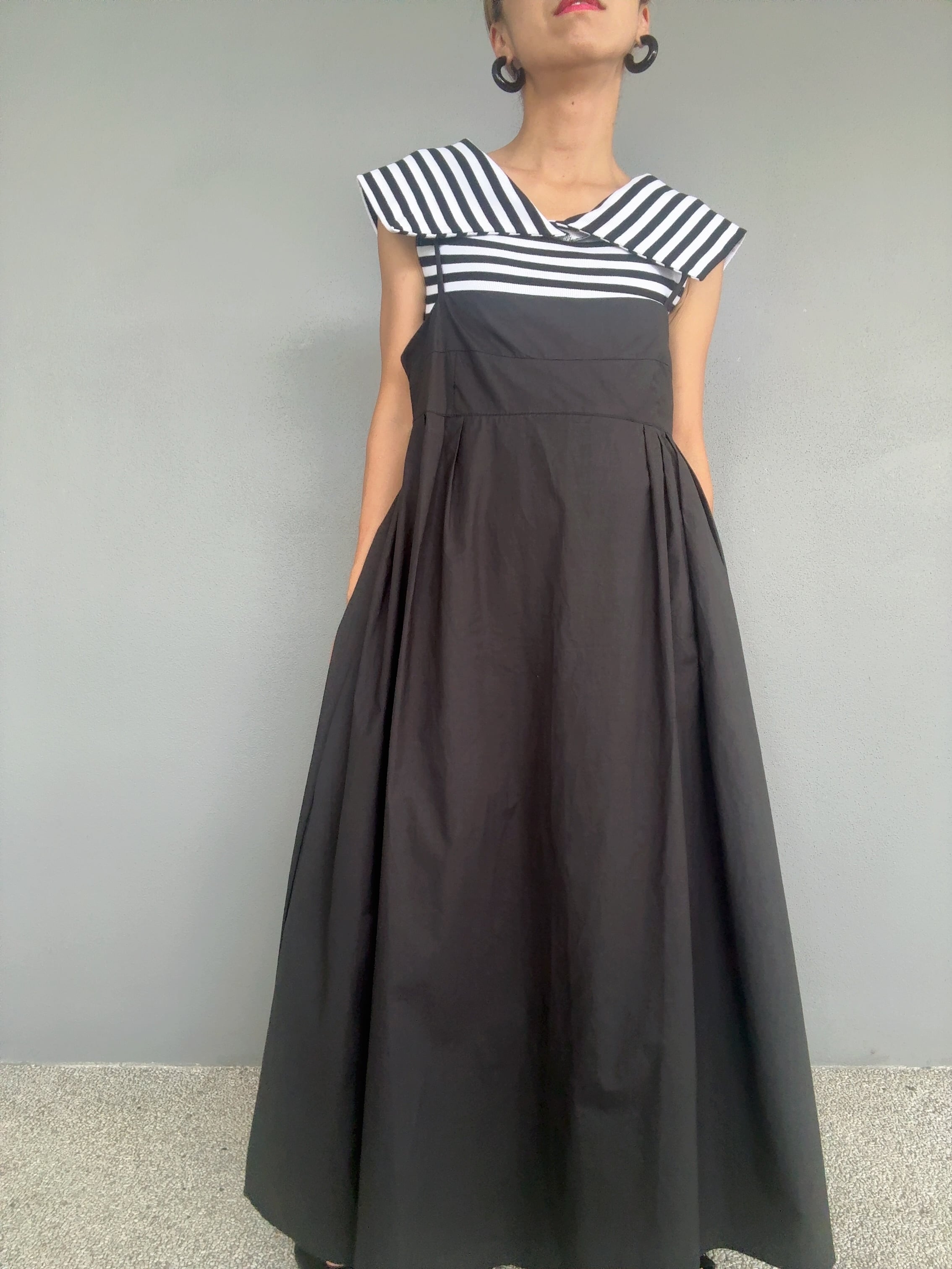 着心地も良く、隠しサイドジップを仕込み、スッキリもたつかないシルエットがポイント。フリーサイズでバスト幅が緩めの楽ちんパターンに再構築いたしました。フリーサイズでバストは緩め、背中にはバックゴムがあり、約10cm伸びます。