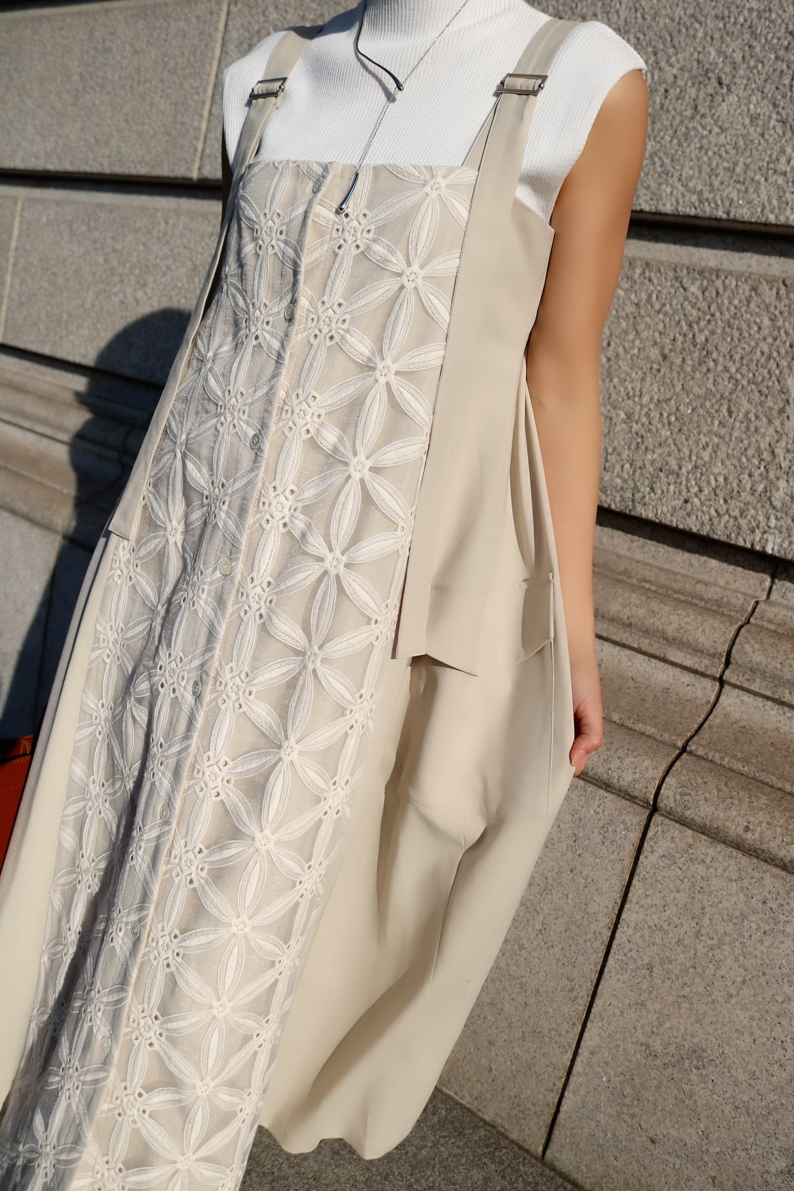 フロントパネルにアスタリスク刺繍を施した落ち感のあるとろみ生地は、裾周りに用尺をたっぷりと使用してお作りし、動きと余韻を意識したシルエットがMARIAの拘りとなっております。