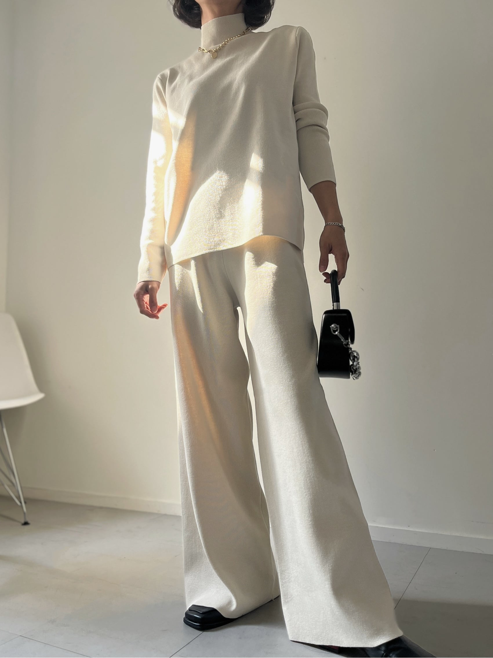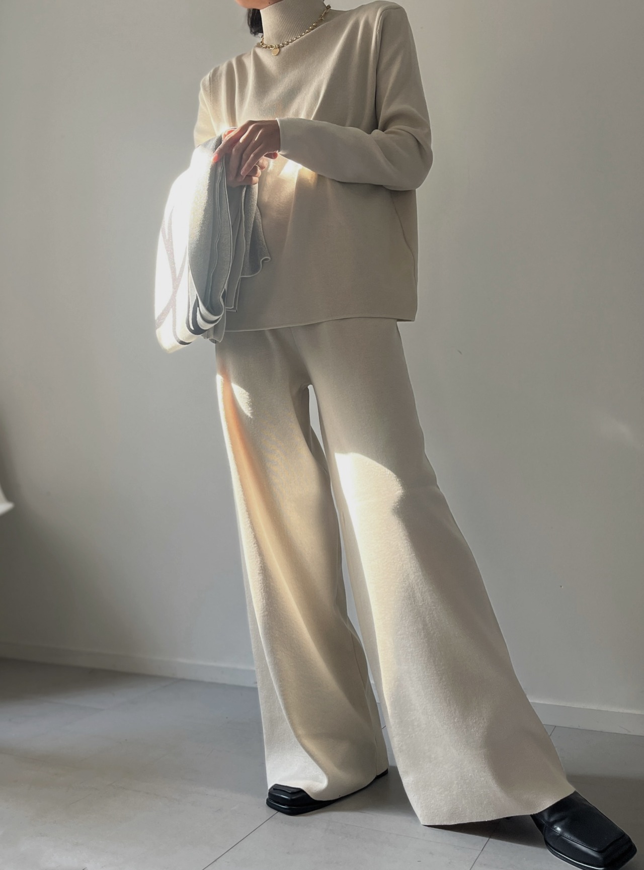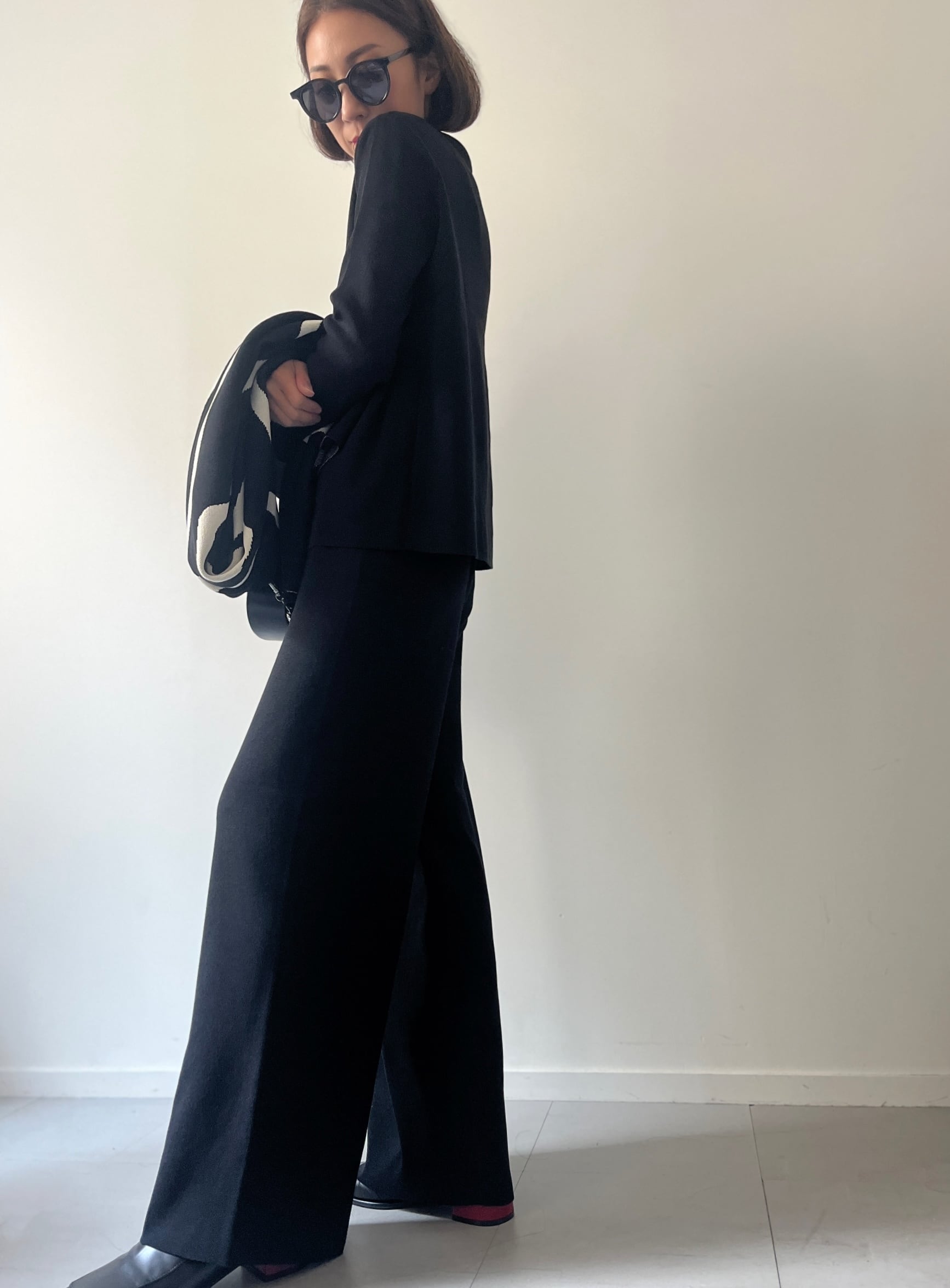 シンプルなパンツセットアップニットはきめ細かい編み地のニットで毛玉になりにくいサラリとした素材が特徴のニットでございます。