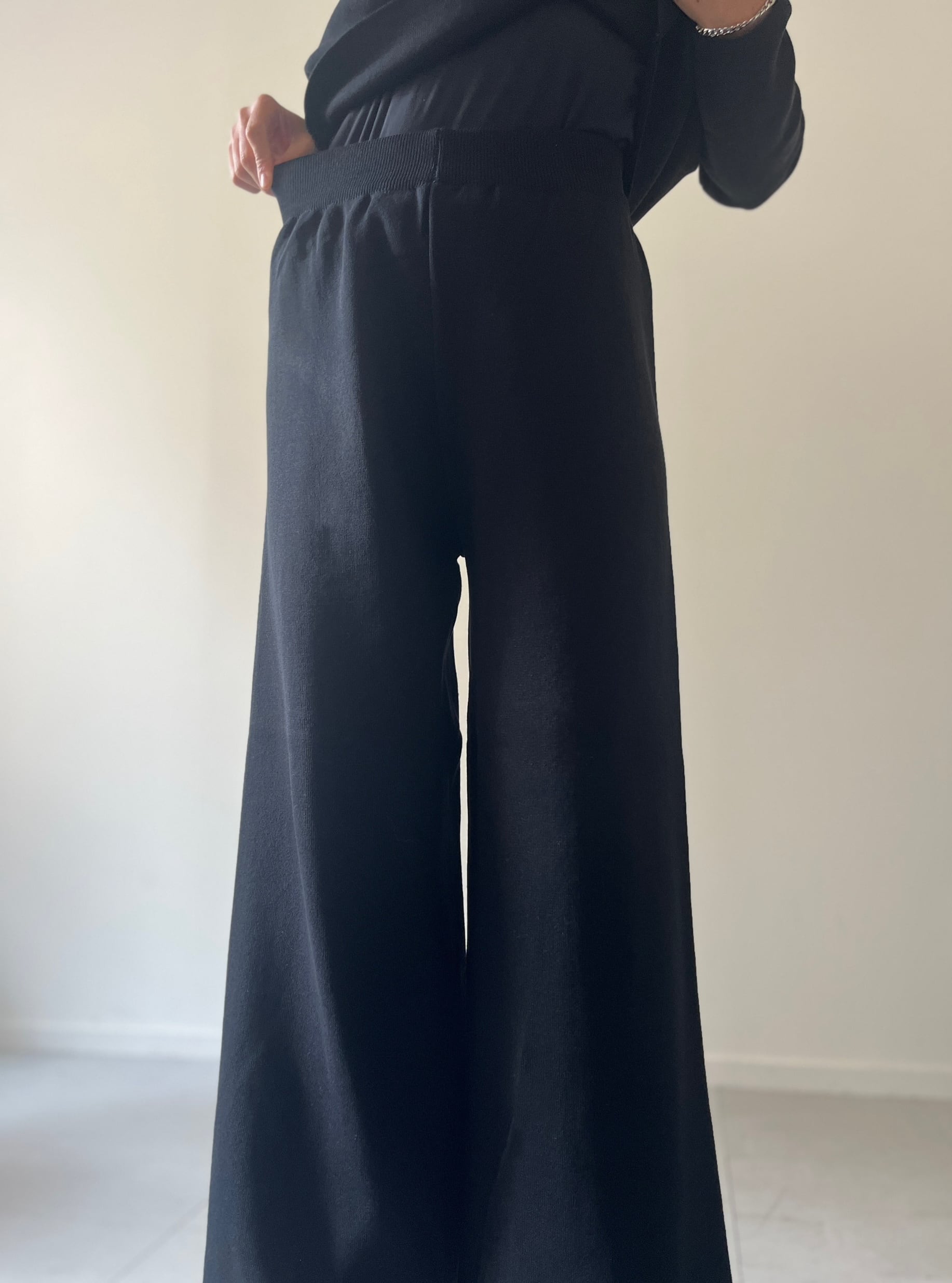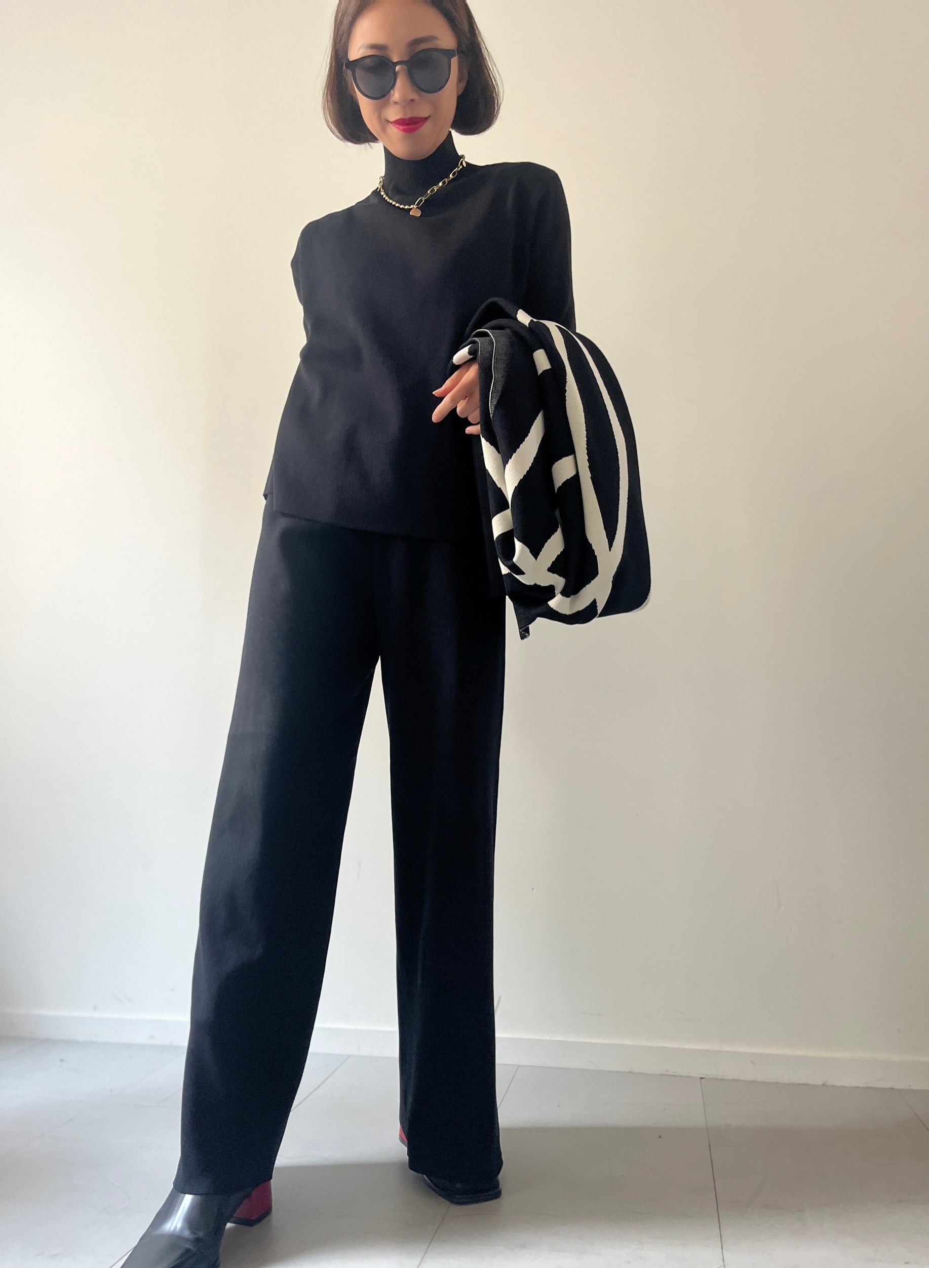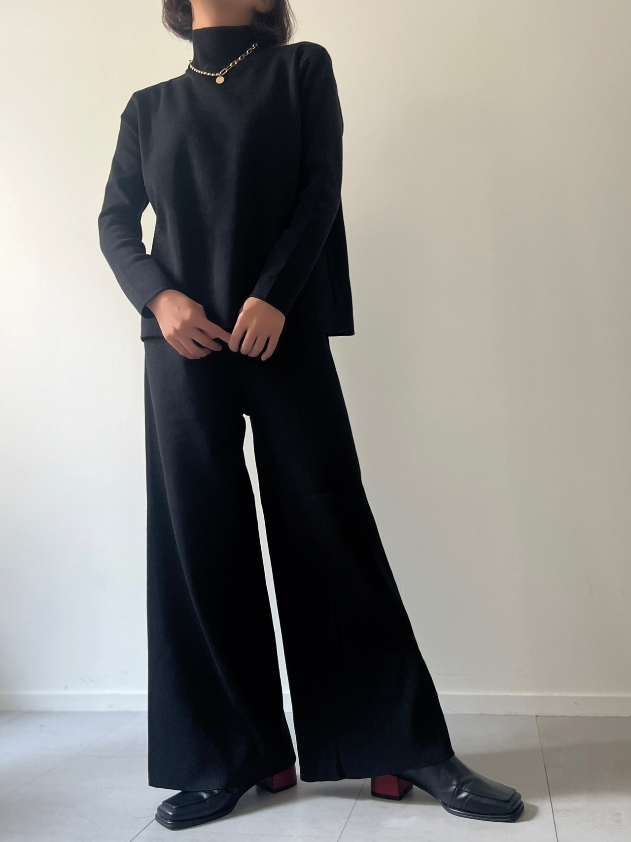 シンプルなパンツセットアップニットはきめ細かい編み地のニットで毛玉になりにくいサラリとした素材が特徴のニットでございます。