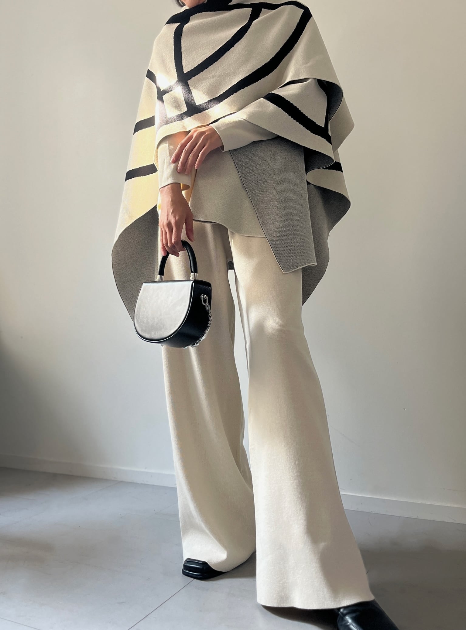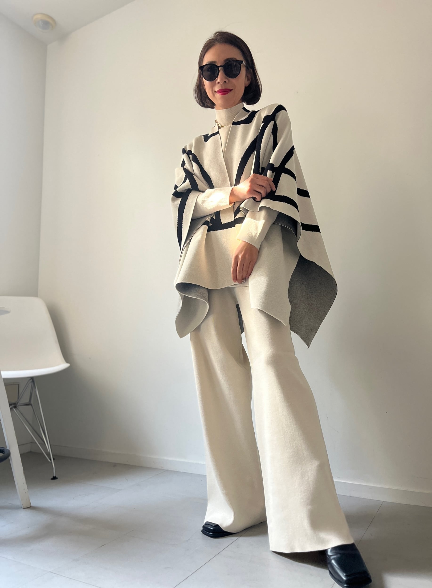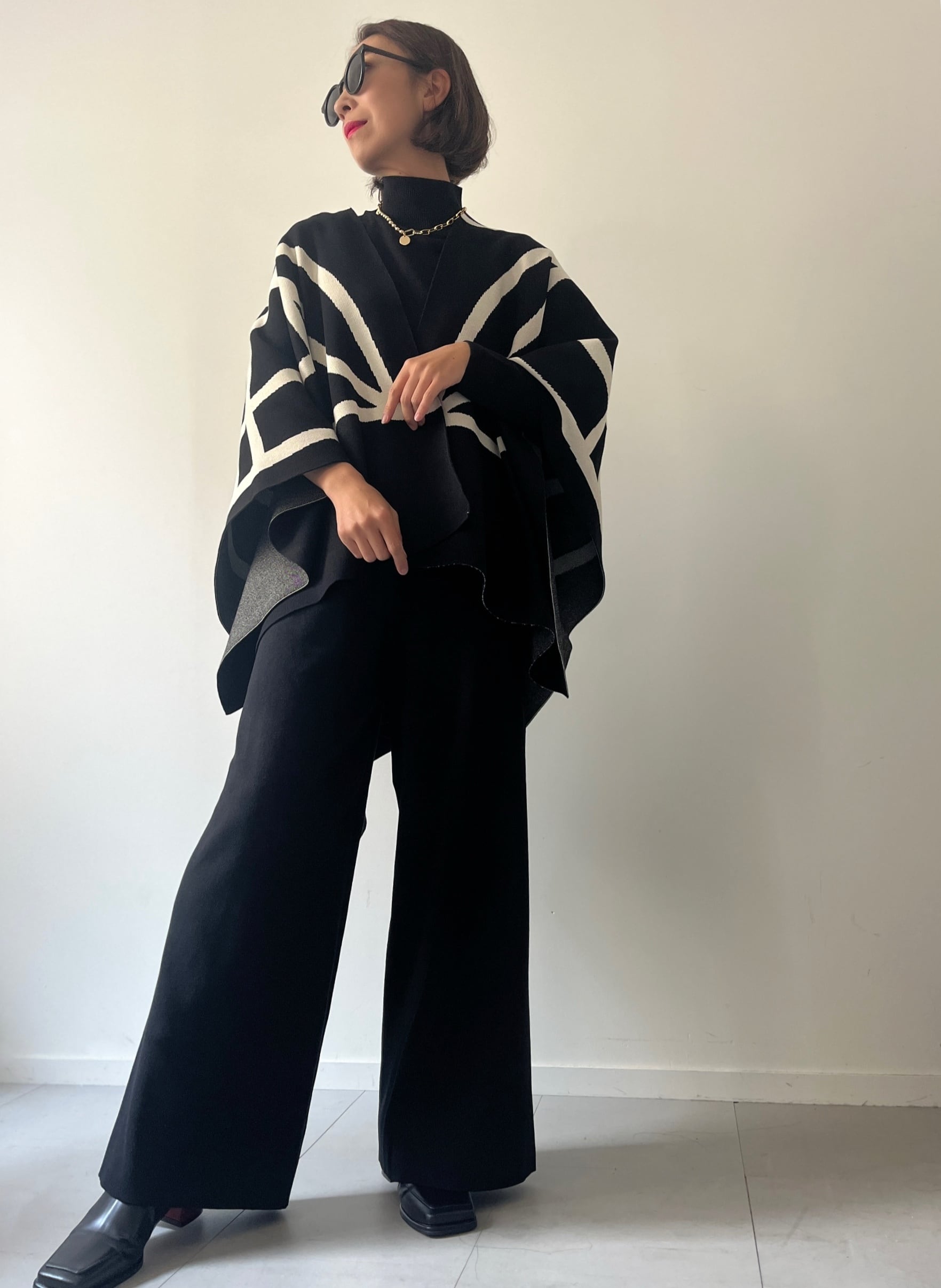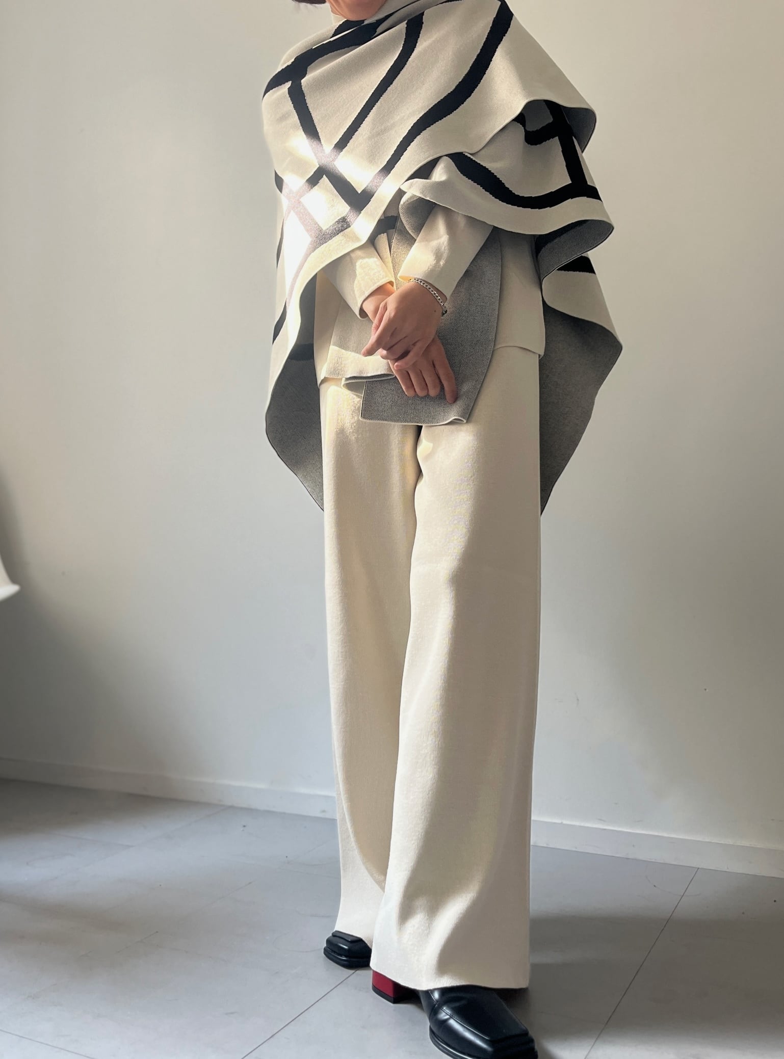 大判なショール付きのニットセットアップが新登場。上半身を綺麗に覆えるサイズ感のニュアンスラインがスタイリッシュな雰囲気を演出致します。
