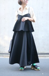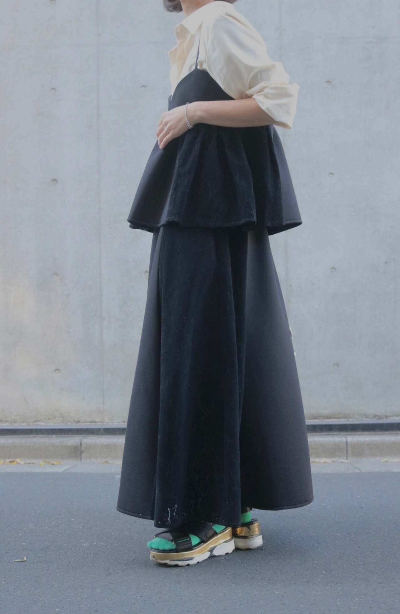 サイド部分にはスウェード素材のレースをあわせました。膝までの裏地付きでスカートの裾部分は透け感のある上品な抜けを演出。
